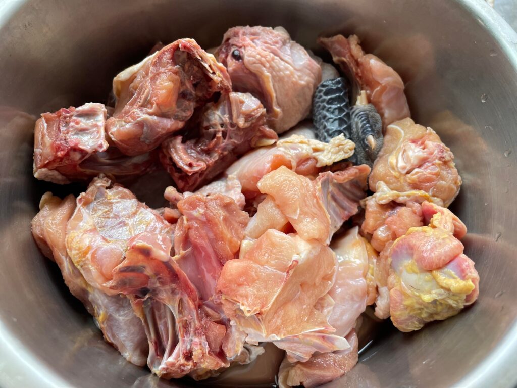 雞肉洗淨後入冷水煮滾川燙,川燙後撈起備用。(約6-8分鐘)