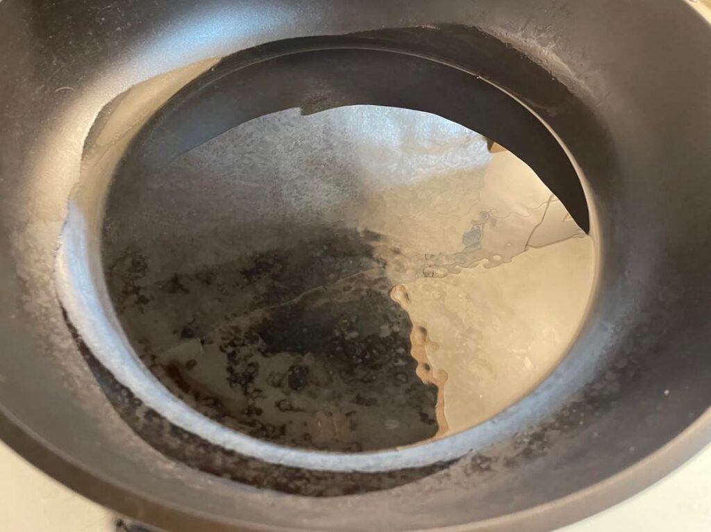 將古早味蛋餅皮起鍋後倒入蛋液,再將餅皮放於蛋液上方。